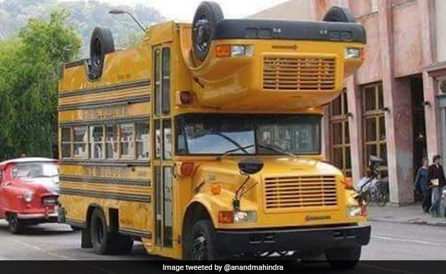 This morning, Anand Mahindra shared a caption competition on Twitter with a photograph that shows a bus with headlights and wheels on top too.