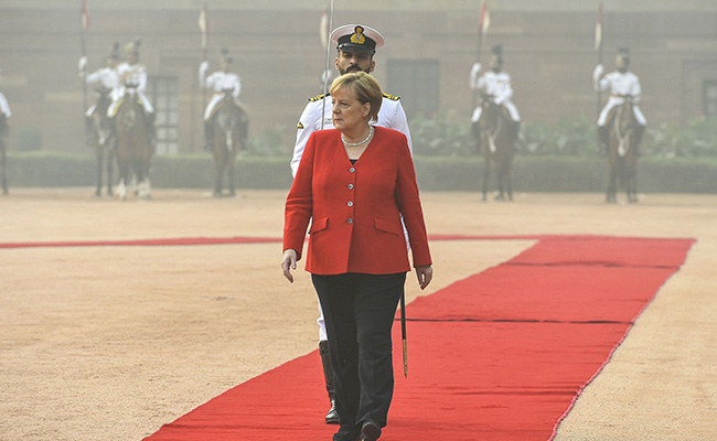 German Chancellor Angela Merkel today received a ceremonial welcome at Rashtrapati Bhavan in New Delhi, ahead of her meeting with Prime Minister Narendra Modi.