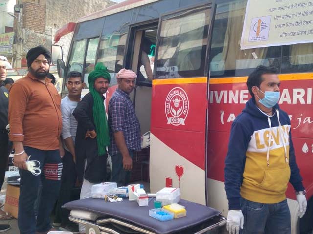 Several protesting farmers queued up here at the Singhu border on Monday to register their names for a blood donation camp set up by a Ludhiana-based NGO.