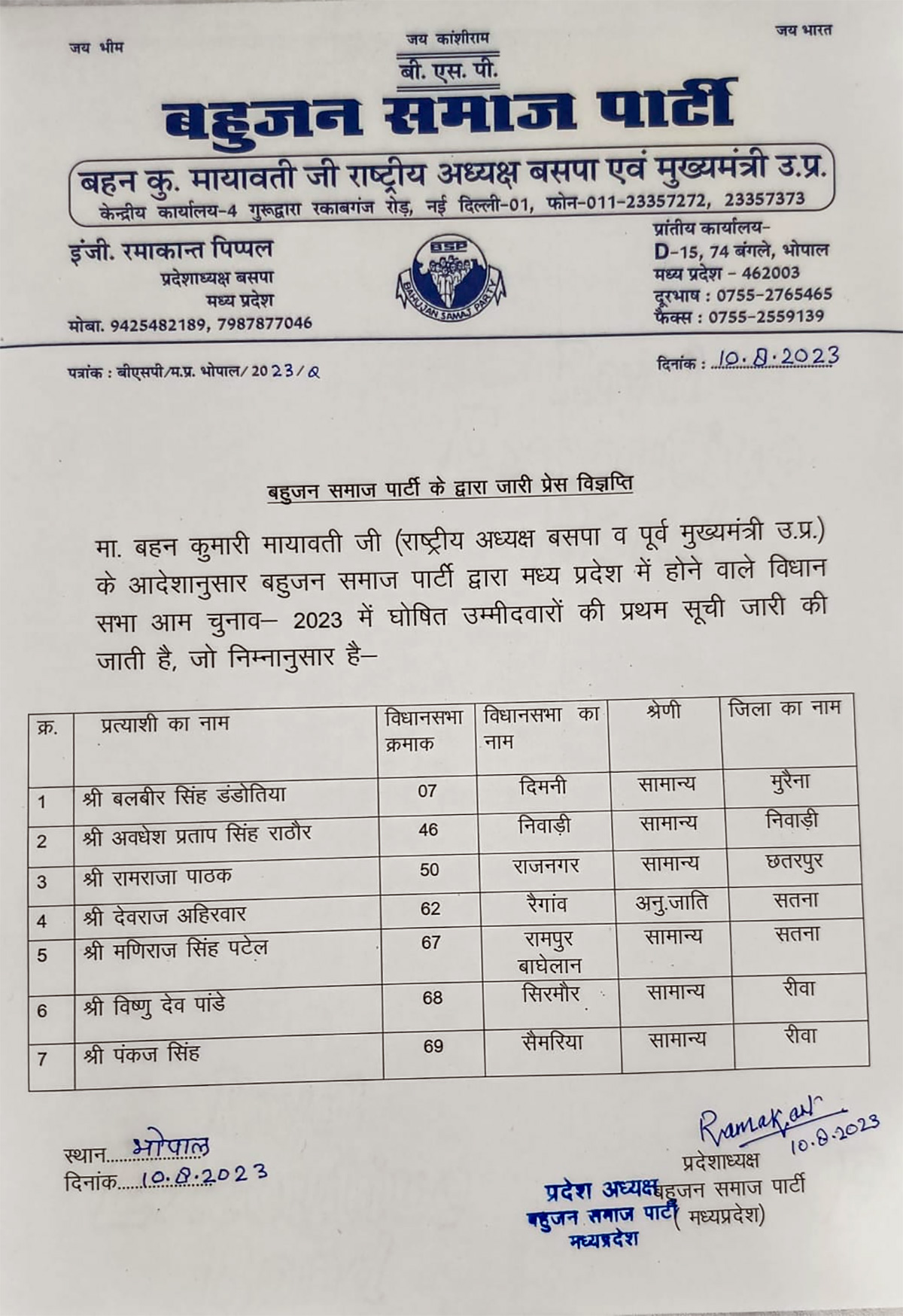 The Bahujan Samaj Party (BSP) released a list of its first seven candidates for the upcoming Assembly election in Madhya Pradesh which is scheduled for later this year.
