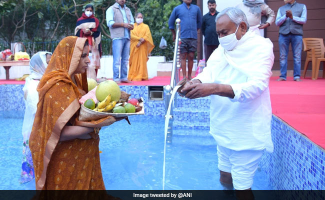 Photos: Nitish Kumar Takes Part In Chhath Puja Rituals At Home