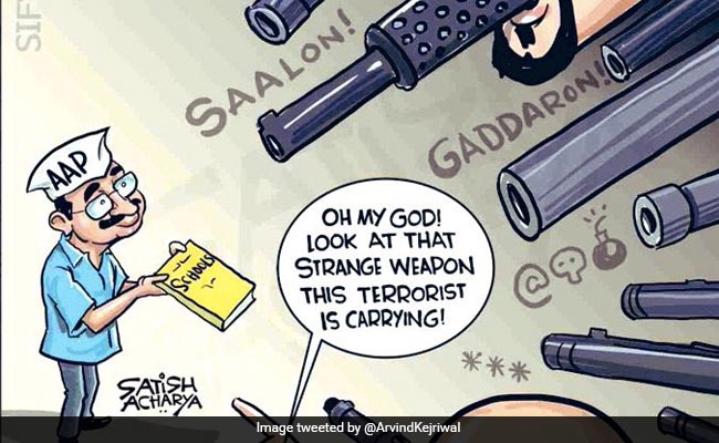 Delhi Chief Minister Arvind Kejriwal - labelled a terrorist by the BJP and the Congress over allegations he made separatist comments - hit back with a cheeky cartoon that showed him targeted by guns 'firing' as he holds out a book titled 'schools'.