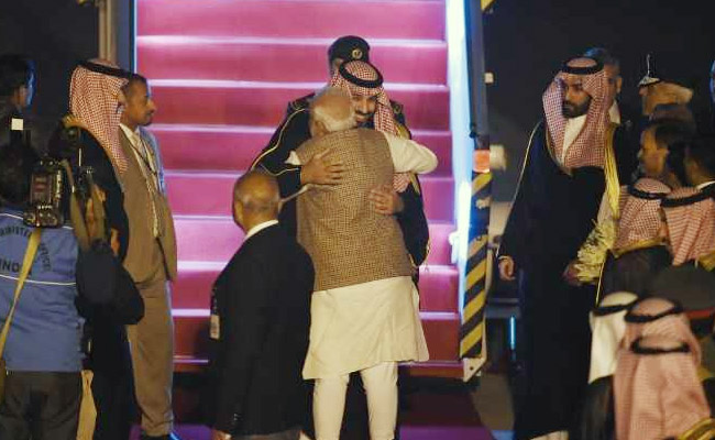 Saudi Arabia's Crown Prince Mohammed bin Salman arrived in New Delhi for a day's visit on Tuesday evening. He was received by Prime Minister Narendra Modi at the airport with a warm hug. The visit will be closely watched for talks between the two leaders on terrorism and trade. Amid India's efforts to diplomatically isolate Pakistan as punishment f...