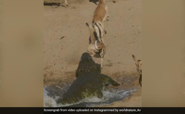 The deer tries to wriggle out of the crocodile's jaws but all the efforts go in vain. The video has shocked the internet.