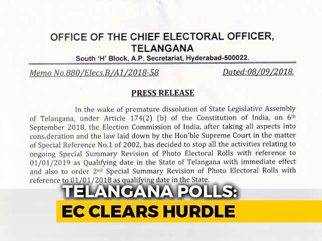 Clearing a key technical hurdle to organising early assembly elections in Telangana, the Election Commission of India on Saturday announced that a final voter list will be published on October 8. The poll body suspended the ongoing process of revision of electoral rolls in the wake of premature dissolution of the state assembly and declared a new s...