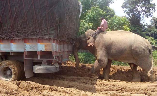 Truck drivers stuck on a national highway on the Assam - Tripura border that has turned to slush are turning to desperate measures to get moving, including enlisting an elephant to try and push their trucks ahead, but without much success.