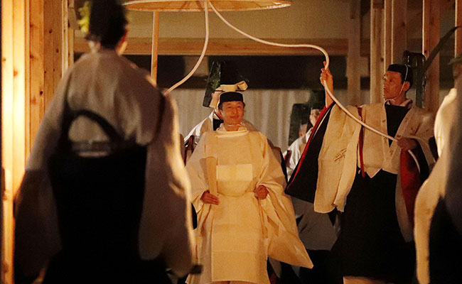 Japanese Emperor Naruhito, dressed in pure white robes, was ushered into a dark wooden hall by torchlight on Thursday night to start his last major accession rite after becoming emperor this spring: spending the night with a goddess.