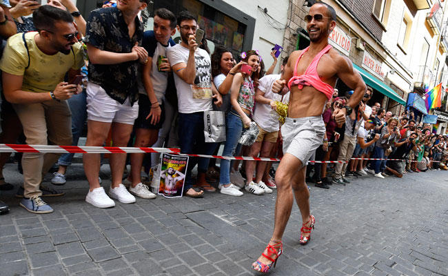 Men taped stiletto-heeled shoes to their feet and raced down a narrow cobbled street in Madrid on Thursday as part of the city's Gay Pride festival, one of the world's largest LGBT pride celebrations.