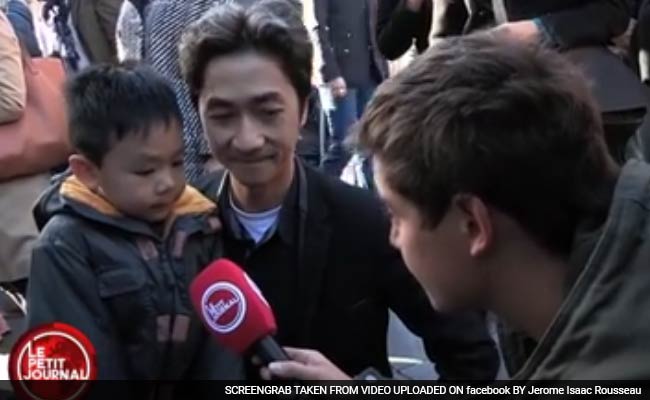 Near the Bataclan Theatre in Paris, where 89 concert-goers were killed in the Friday terror attacks, a little boy gets gentle reassurance from his father that terrorists 'have guns but we have flowers'.