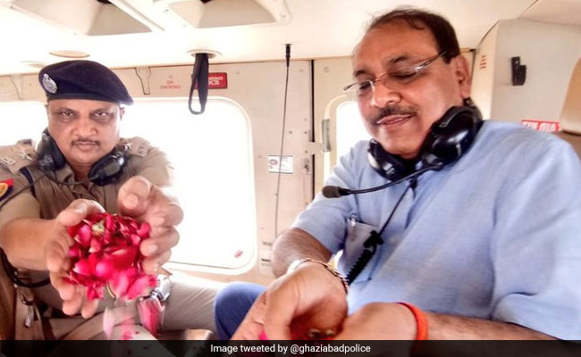 In keeping with the novel practice started by the Uttar Pradesh government last year, Kanwar pilgrims were on Monday showered with flower petals from helicopter in Ghaziabad by top administrative officials.