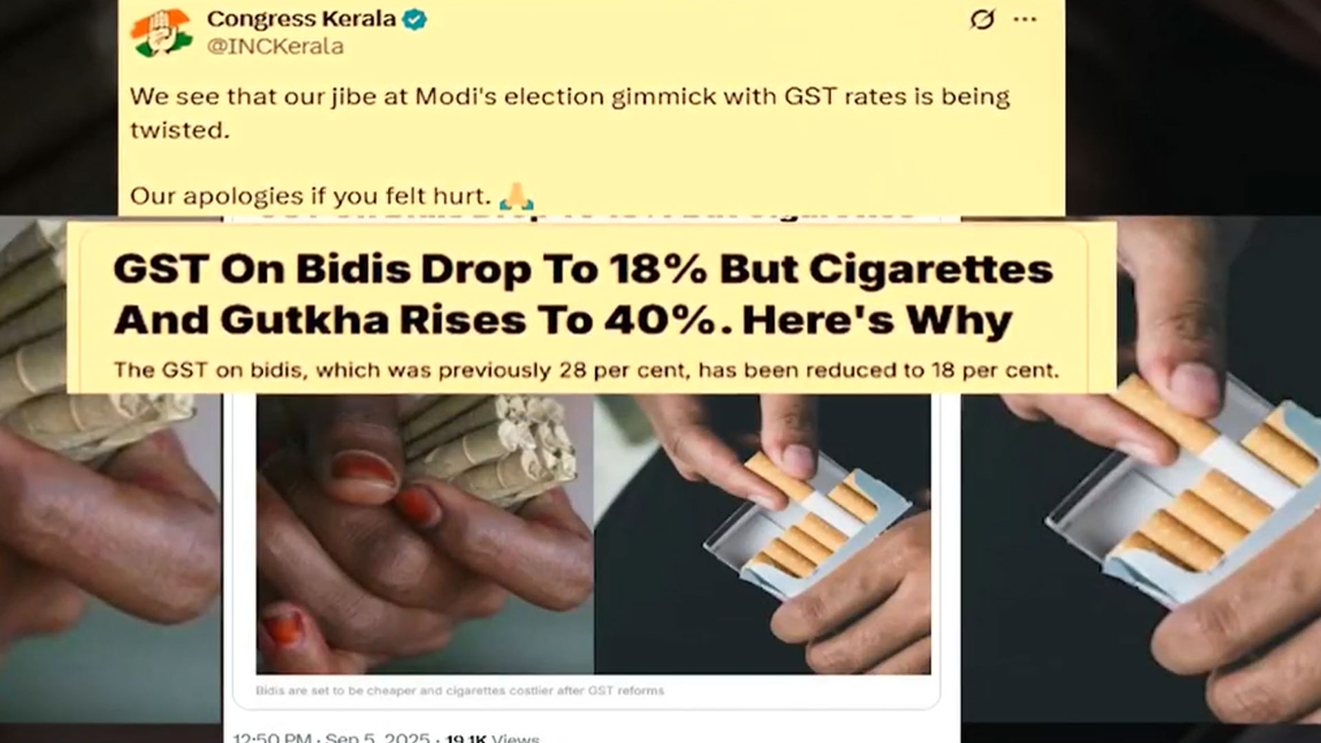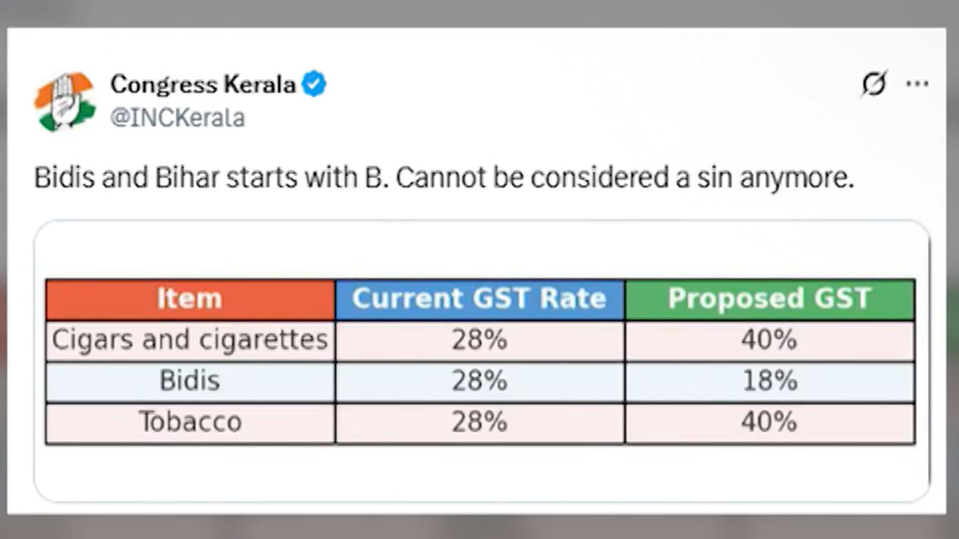 In a now-deleted post on X, the Congress said that "Bidis and Bihar start with B" and "cannot be considered a sin anymore", referring to the GST cut on the tobacco product.
