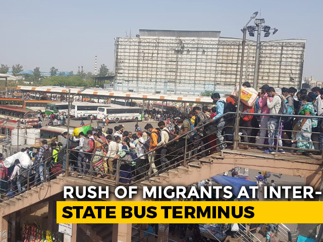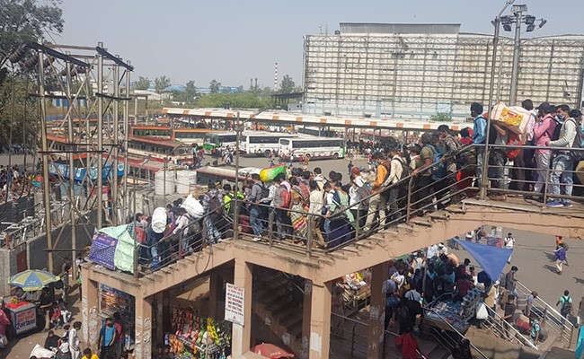 Thousands of migrant workers gathered at Anand Vihar ISBT here to catch a bus home, hours after Chief Minister Arvind Kejriwal announced a week-long lockdown and appealed to them with folded hands not to leave Delhi.