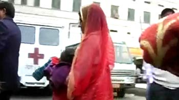 Dressed in a red lehenga-odhna (the traditional garb for women in Rajasthan), a young mother sits outside a government hospital in Jaipur.