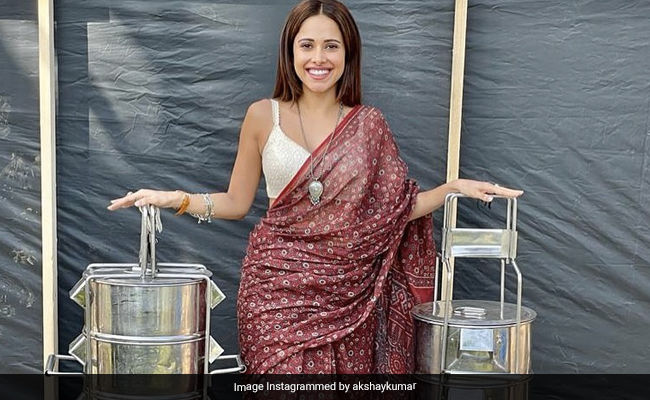 In the picture, Nushrratt Bharuccha can be seen smiling while holding 5-tier tiffin containers