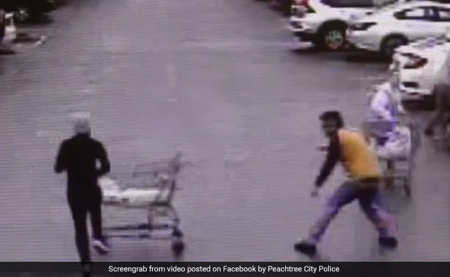 A man in Georgia, US, is being praised for his quick thinking in pushing a grocery cart in the way of a shoplifting suspect on the run, thwarting his escape bid.
