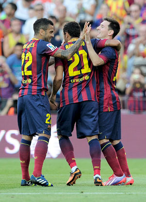Goals from Alexis Sanchez, Lionel Messi, Dani Alves, Pedro and Xavi gave the defending champions a 7-0 victory vs Levante.