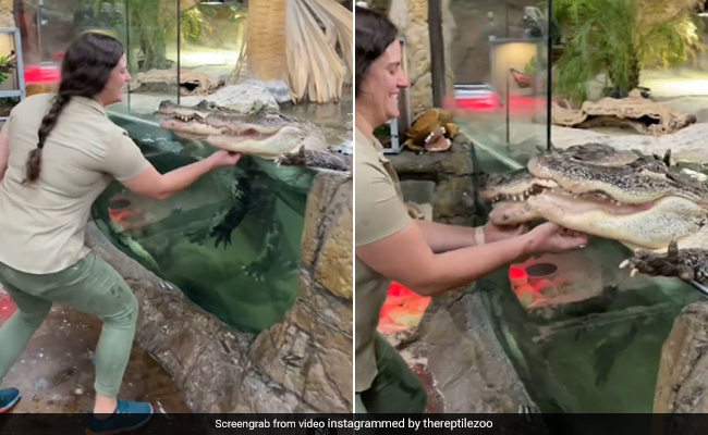 One zookeeper at California's Reptile Zoo was brave enough to pet not one, but two alligators at once. A jaw-dropping video shared by the zoo shows a woman approaching two alligators and scratching their chins.