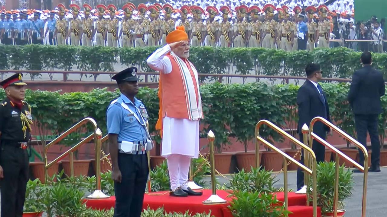 Prime Minister Narendra Modi marked the 79th Independence Day with his signature flair, sporting a saffron turban for his 12th consecutive address to the nation from the historic ramparts of the Red Fort here.
