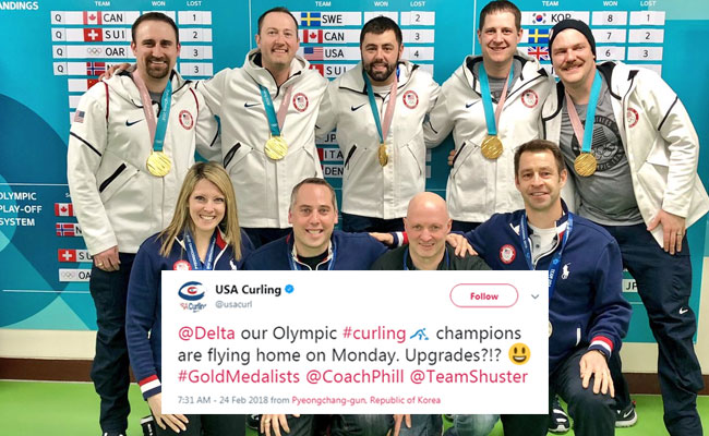 The US curling team tweeted Delta Airlines to ask if they had any upgrades to offer the Olympic champions flying back on Monday.