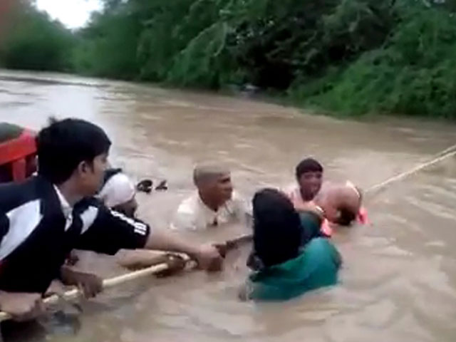 In a dramatic rescue after a minister received a midnight SOS call, villagers and officials waded into rising water to pull out three people whose car had been swept away in Maharashtra, where heavy monsoon rain has caused floods in many areas.