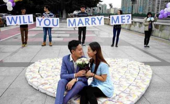 Instead of getting down on his knees with a diamond ring in his hand, a young man in China's Guangdong province proposed to his girlfriend with over 50 packs of diapers, the media reported on Tuesday.