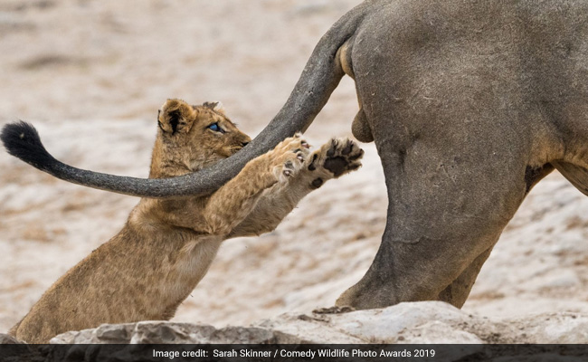 An awkwardly-timed photograph of a lion cub has been adjudged the funniest animal photo of the year at Comedy Wildlife Photography Awards 2019.
