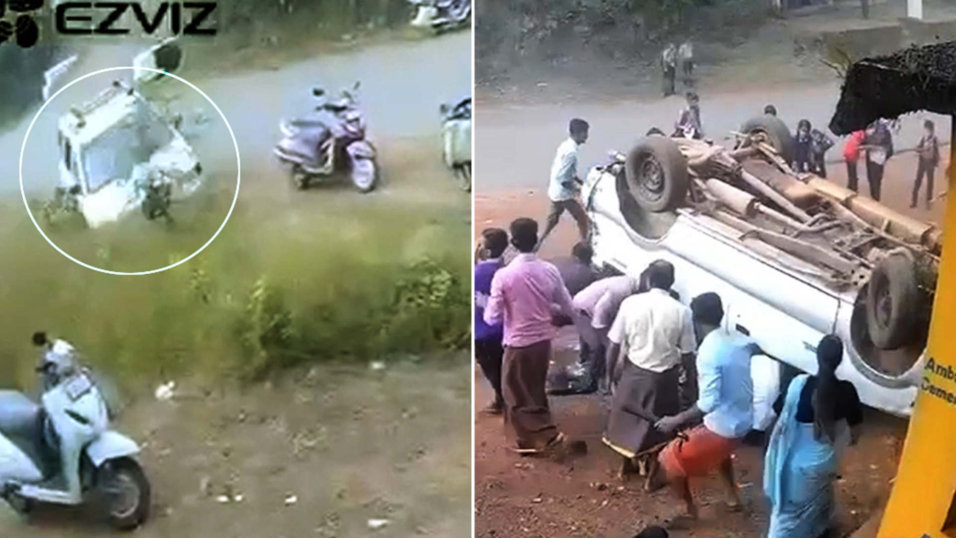 A dashboard camera footage in the car behind the bus shows the driver attempting to overtake another school bus from the left on the Balagere Main Road.