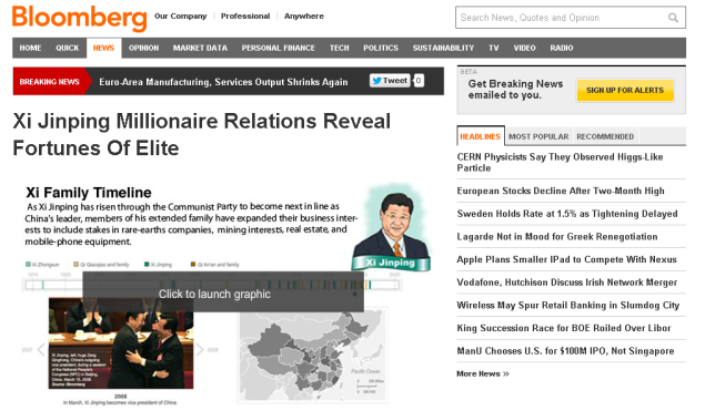 China blocked access to Bloomberg's website on the mainland after the business and financial news agency published a report Friday detailing the multimillion-dollar assets of relatives of the man set to become the country's next president.