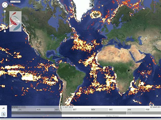 The tool uses data points from the Automatic Identification System network, which picks up GPS broadcasts of a vessel's location to map movements.
