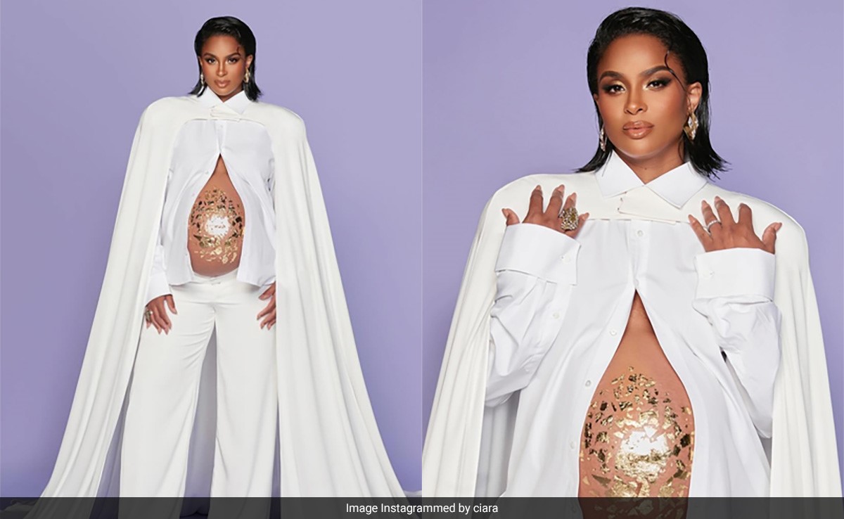 In A White Co-Ord Set And Cape, Ciara's Gorgeous Gold Baby Bump Takes Centerstage