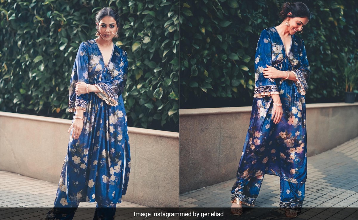 Genelia D'Souza's Deep Blue Kaftan Set With A Nath Gives A Traditional Twist To Summer Festive Looks