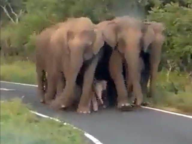 The viral video shows the mother elephant crossing the road with her newborn calf, who is still learning to walk perfectly.