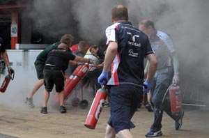 A total of 16 people were injured, one with severe burns, when a fire erupted in the Williams team garage on Sunday in the aftermath of Pastor Maldonado's victory in the Spanish Grand Prix.