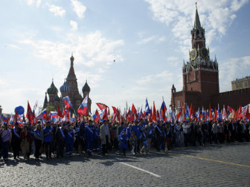 About 100,000 people have marched through Red Square to celebrate May Day; the first time the annual parade has been held outside the Kremlin since the fall of the Soviet Union in 1991