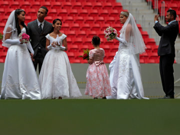 The collective civil marriage ceremony was held Saturday on the soccer field's pitch.