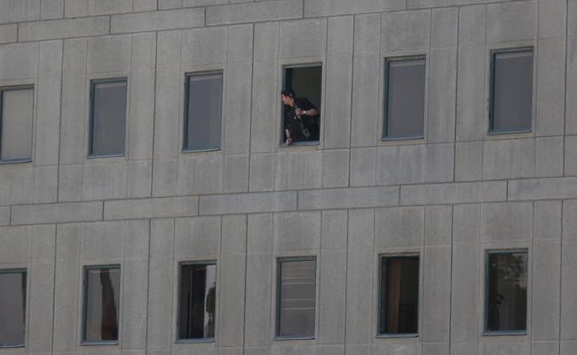 An Iranian policeman looks out of the parliament's building in central Tehran. (Reuters)