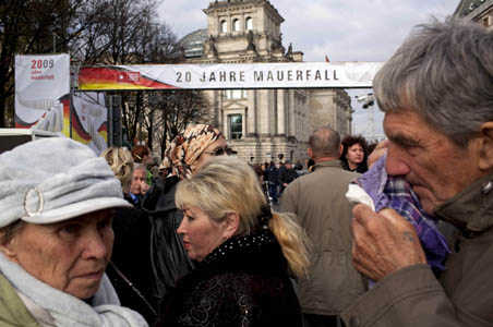 A group of Russian tourists gathered in front of the Brandenburg Gate in Berlin on Friday, Nov. 6, 2009. Europe was transformed by the events of 1989, when the Berlin Wall came down, but the events of that year are seen differently in Europe, the United S