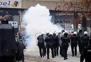 The police use tear gas as a group of ethnic Albanians throw stones at them, during a violent protest of a group of ethnic Albanians in Skopje, Macedonia on Saturday,