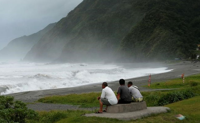 Men watch waves crash at the coast as Typhoon Nepartak approaches in Taiwan on July 7, 2016. (Reuters)
