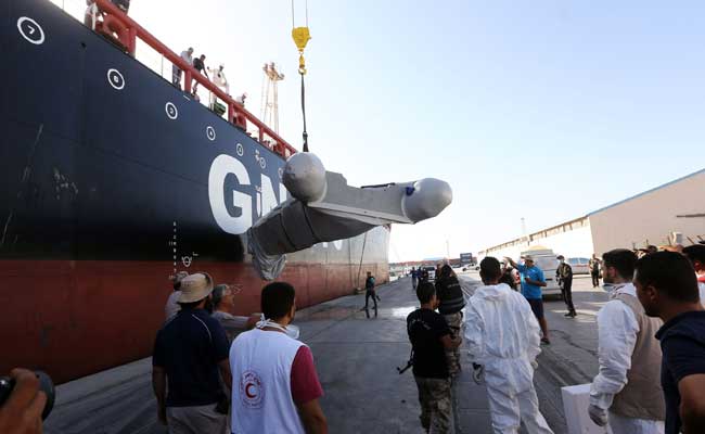 Members of the Libyan Red Crescent and members of the port authorities at Libyan capital Tripoli on September 18, 2015 at Tripoli's port. (AFP Photo)