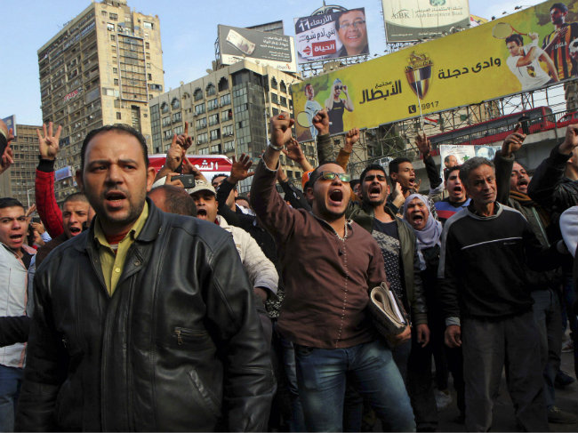 Protesters chant slogans in downtown Cairo, Egypt on January 25, 2015. (Associated Press)