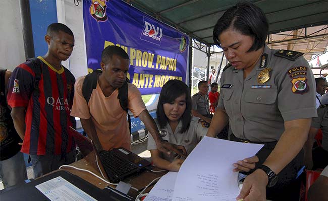 Family members of a passenger on board a crashed Trigana Air flight provide information to a police identification team at Sentani Airport near Jayapura, Papua province, Indonesia. (Reuters Photo)