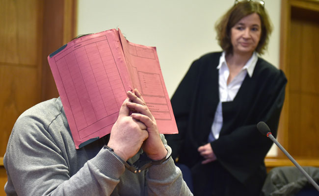 Niels Hoegel with his face behind a folder before the start of a hearing at court. (AFP File Photo)