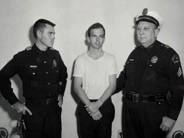 Lee Harvey Oswald, accused of assassinating former U.S. President John F. Kennedy, is pictured with Dallas police Sgt. Warren (R) and a fellow officer in Dallas, in this handout image taken on November 22, 1963