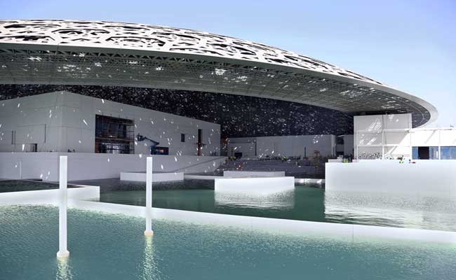 Many of France's grand museums, including the Louvre, the Musee d'Orsay and the Palace of VAbu Dhabi's Louvre museum has been surrounded by sea water in a major step towards completion of the ambitious project, the developer said on Tuesday.