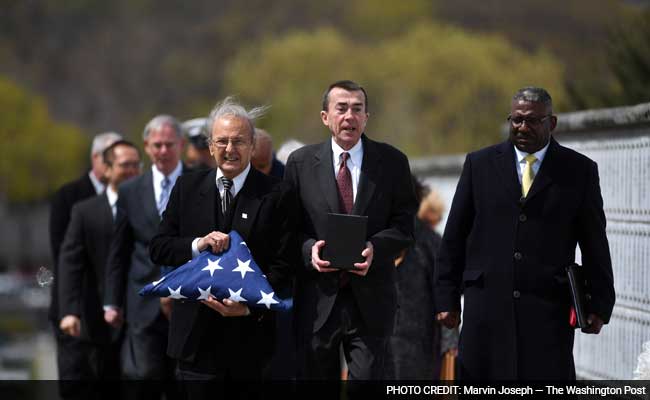 So Friday, with a cool wind whipping across Arlington's hills, the Stars and Stripes draped the cardboard box containing Moore's ashes. A Coast Guard honor guard folded the flag with grave precision before handing it to Sheppard. After the ceremony, Addams was given a felt bag containing the 21 shells fired in Moore's honor.