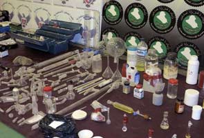 Officials showed reporters three suspects dressed in yellow jumpsuits with their heads covered by masks. They also displayed bottles of chemicals and other lab equipment as well as remote controlled toy helicopters authorities said the men planned to use to disperse the gas.
