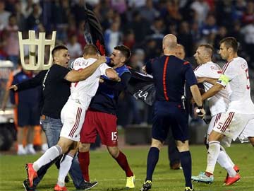 A fight breaks out between Serbian fans and Albanian national team players. (Associated Press)