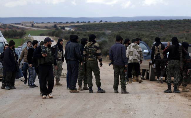 Rebel fighters gather near the front line in Ratain village, north of Aleppo on February 17, 2015. (Reuters)