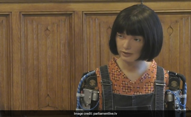 Described as "the world's first ultra-realistic AI humanoid robot artist", it appeared in one of parliament's ornate wood-panelled rooms, wearing a short black-haired wig and denim dungarees.